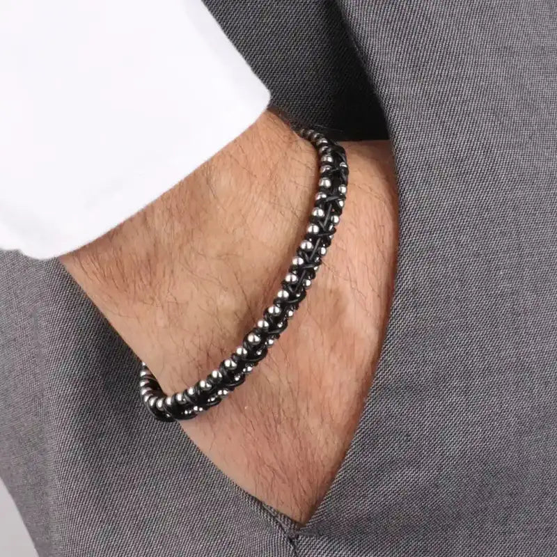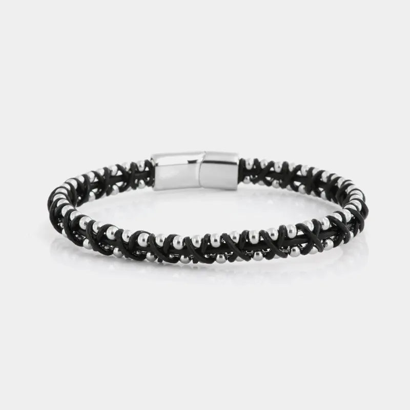 Rigid Steel bracelet in braided black cord combined with shiny metal beads. Hidden clasp