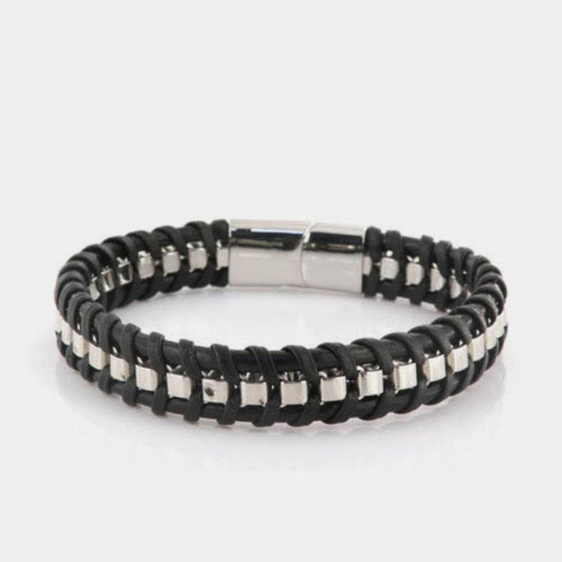 Bracciale in Acciaio rigido in pelle nera intrecciata con una catena in metallo lucido. Chiusura a scomparsa