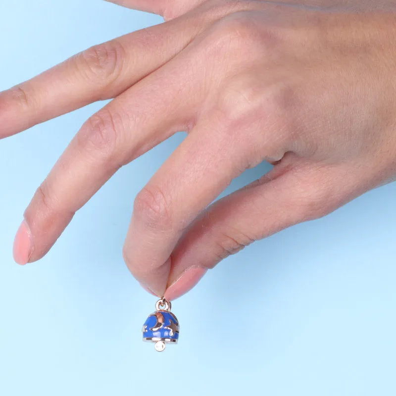 Ciondolo in Metallo con campanella portafortuna smaltata, trama luna e stelle impreziosita da cristalli