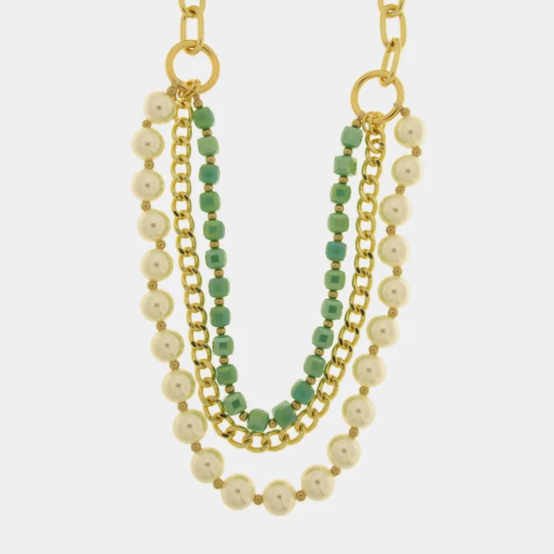 Collana in Metallo mutlifilo con cristalli verdi, perle e catene