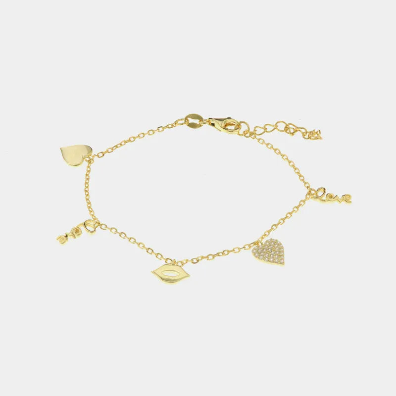 Bracciale in Argento 925 con ciondoli love, bacio e cuore tempestato da zirconi bianchi