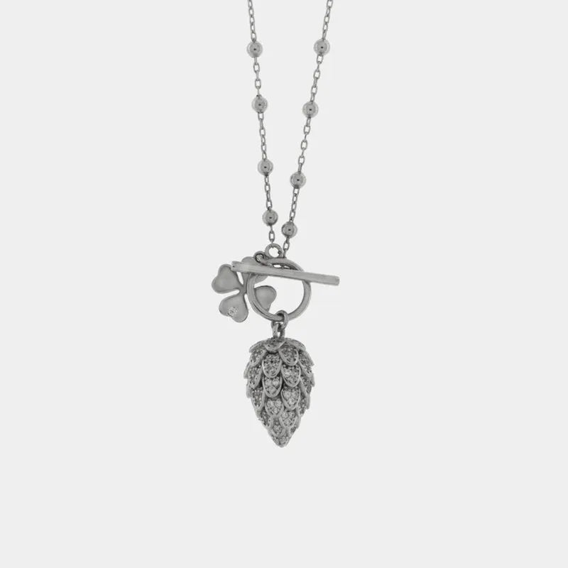 Collana in Argento 925 con pigna pendente, pavè di zirconi bianchi e quadrifoglio con punto luce