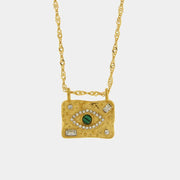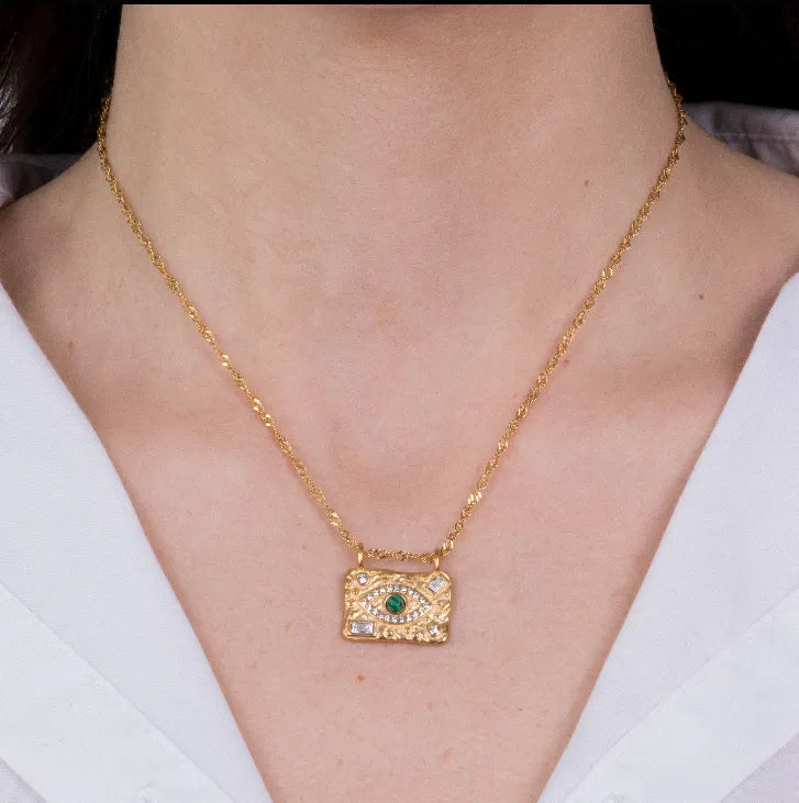 Collana in Acciaio con piastra impreziosito da occhio verde