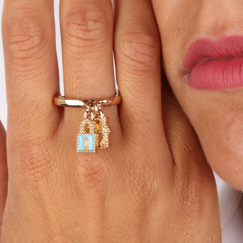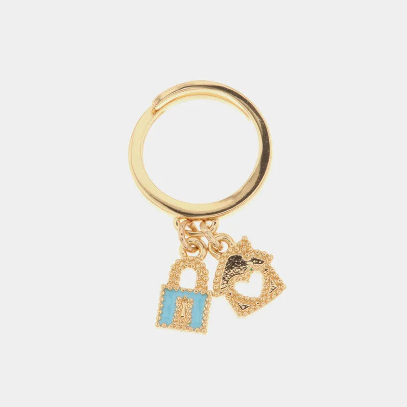 Anello in Metallo con pendenti impreziositi da smalti colorati a forma di lucchetto e casa con cuore