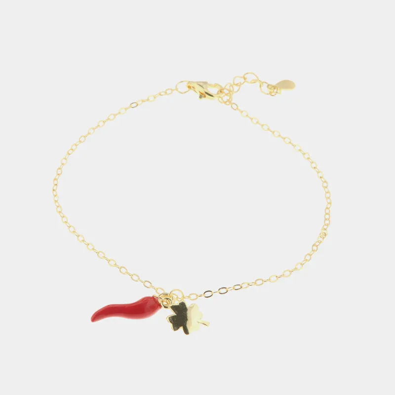 Bracciale in Argento 925 con cornetto portafortuna impreziosito da smalto rosso e quadrifoglio