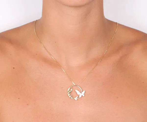 925 Silver Necklace with Circle-Shaped Pendant Featuring Butterfly and Zirconia