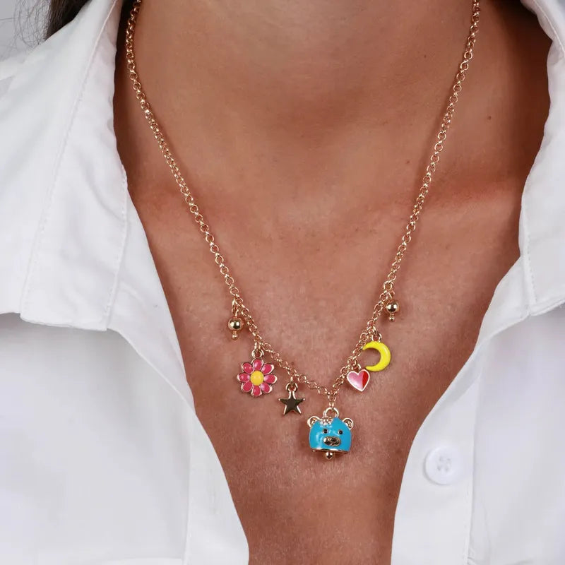 Collana in Metallo con campanella a forma di orsetto blu e piccola margherita, luna e cuore