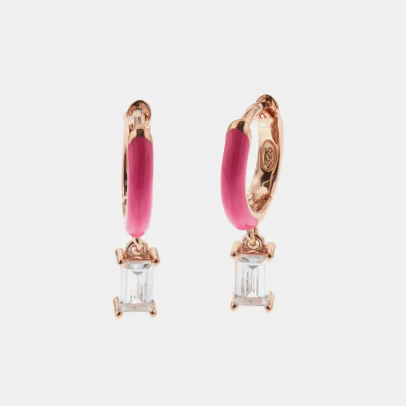 Orecchini in Argento 925 cerchietti smaltati rosa con zircone bianco pendente