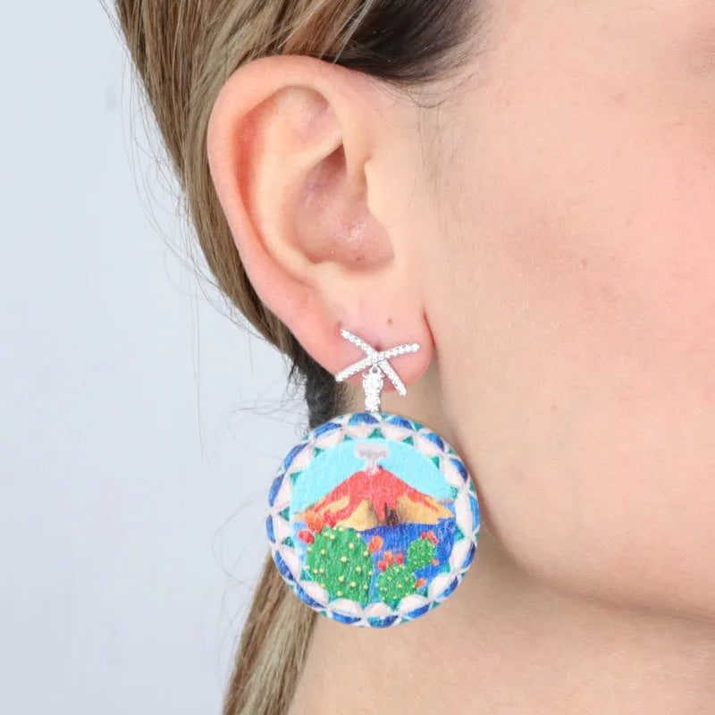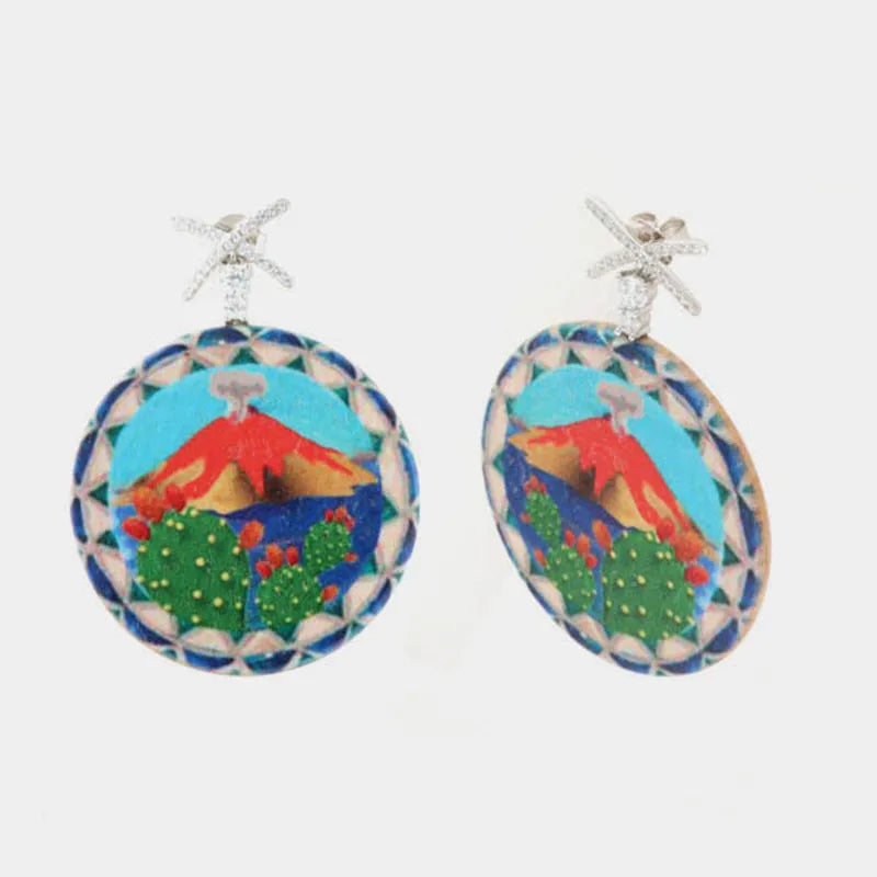 Orecchini in Argento 925 in legno, con stampa colorata, etna e fichi d'india, impreziositi da zirconi bianchi
