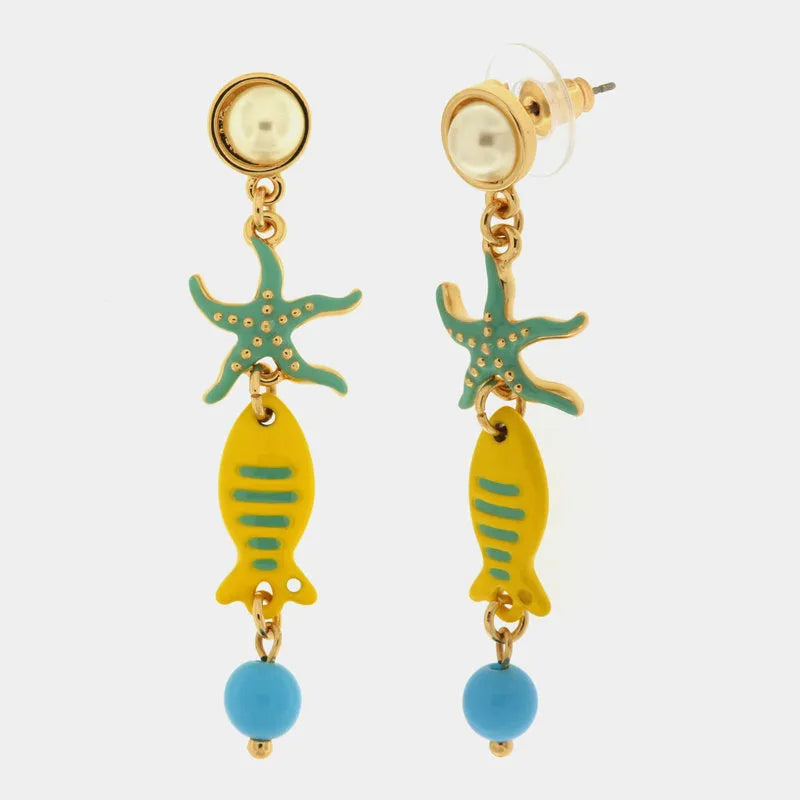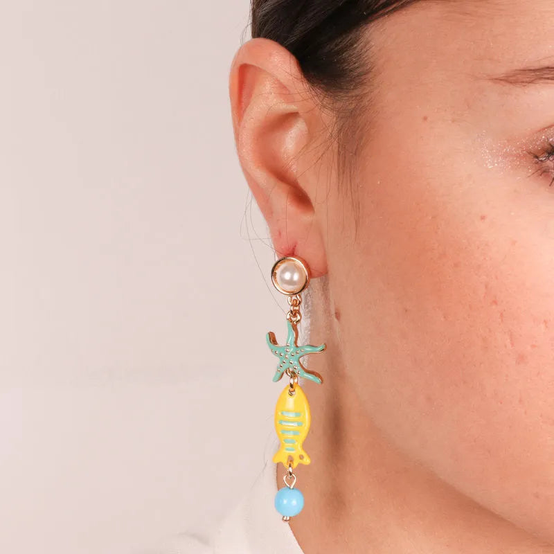 Orecchini in Metallo con perla al lobo e stella marina e pesciolino pendenti