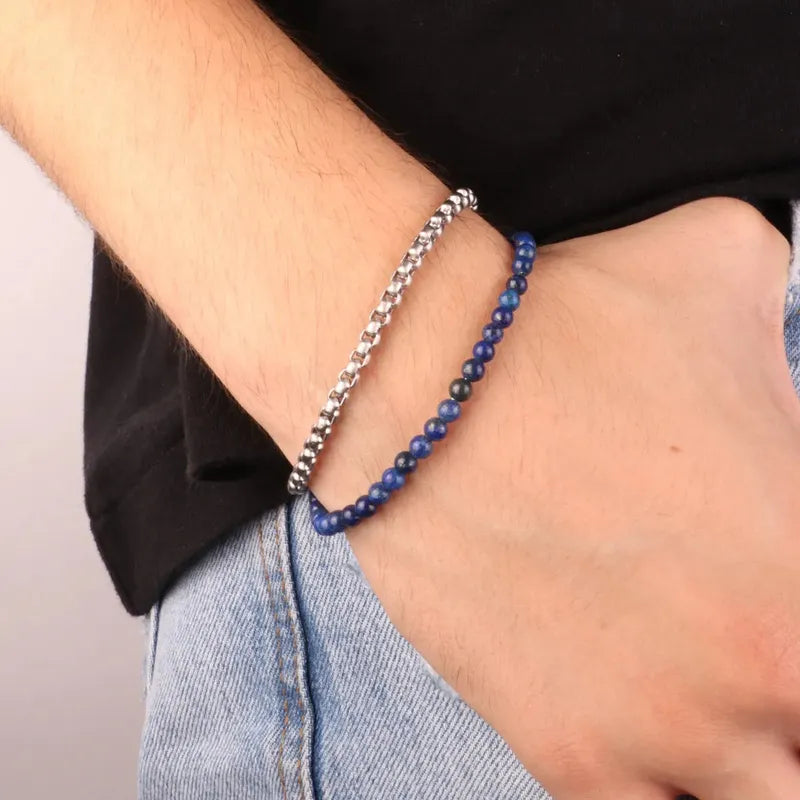 Bracciale in Acciaio doppio filo con tramatura in acciaio e sfere in sfumature di blu