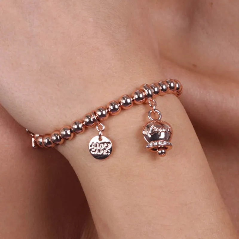 Bracciale in Metallo maglia a sfere, con campanella scritta capri pendente, impreziosita da cristalli
