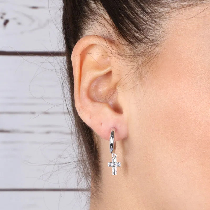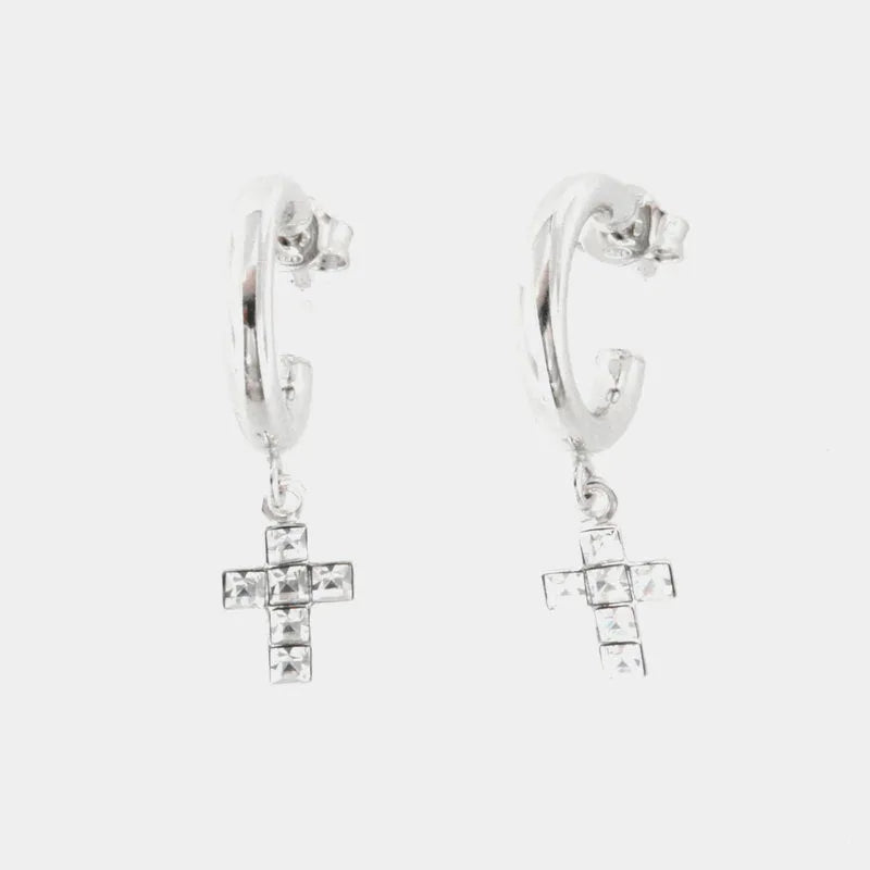 Orecchini in Argento 925 a cerchietto, con croci di cristalli bianchi