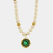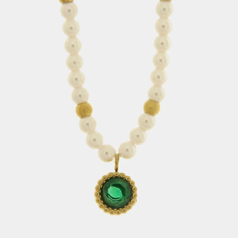 Collana in Acciaio con giro di perle e cristallo verde
