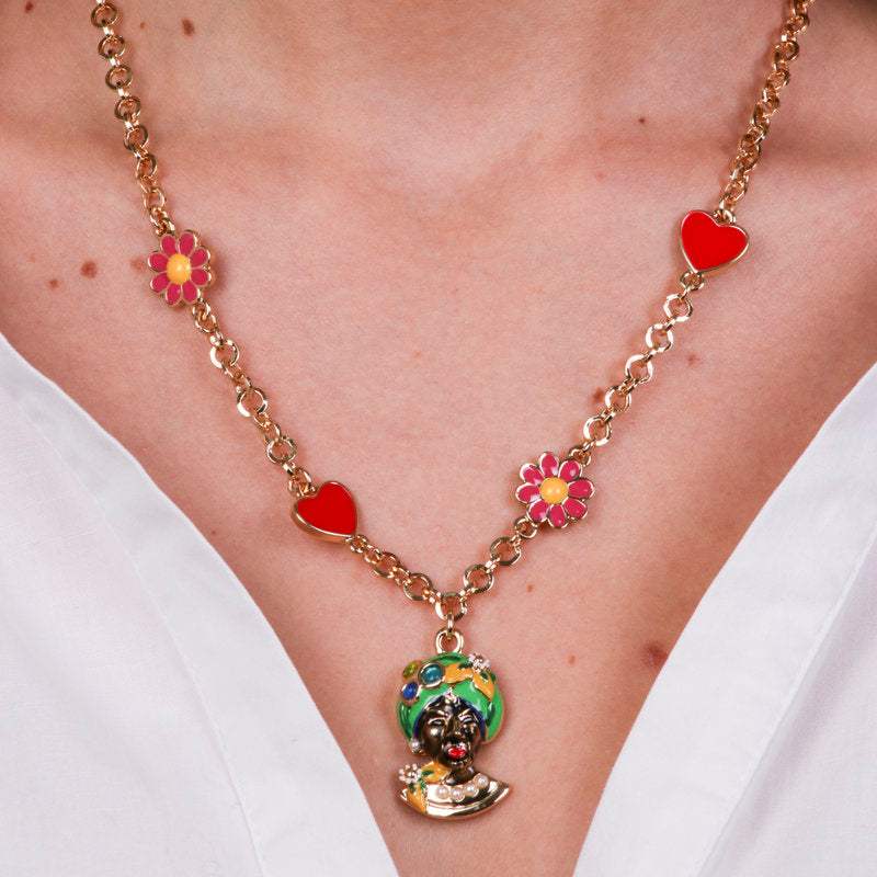 Collana in Metallo con Testa di Moro verde, cuori e fiori