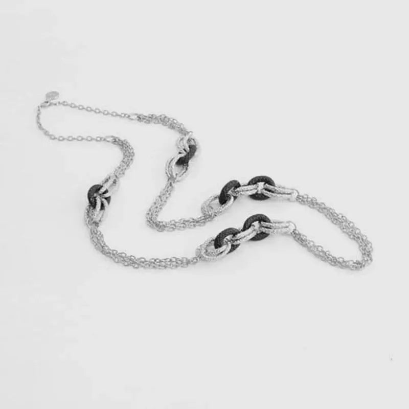 Collana in Metallo a catena multifilo lunga, impreziosita da anelli a lavorazione martellata smaltati neri