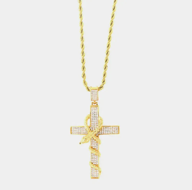 Collar de Acero con colgante religioso en forma de cruz con serpiente adornada con cristales