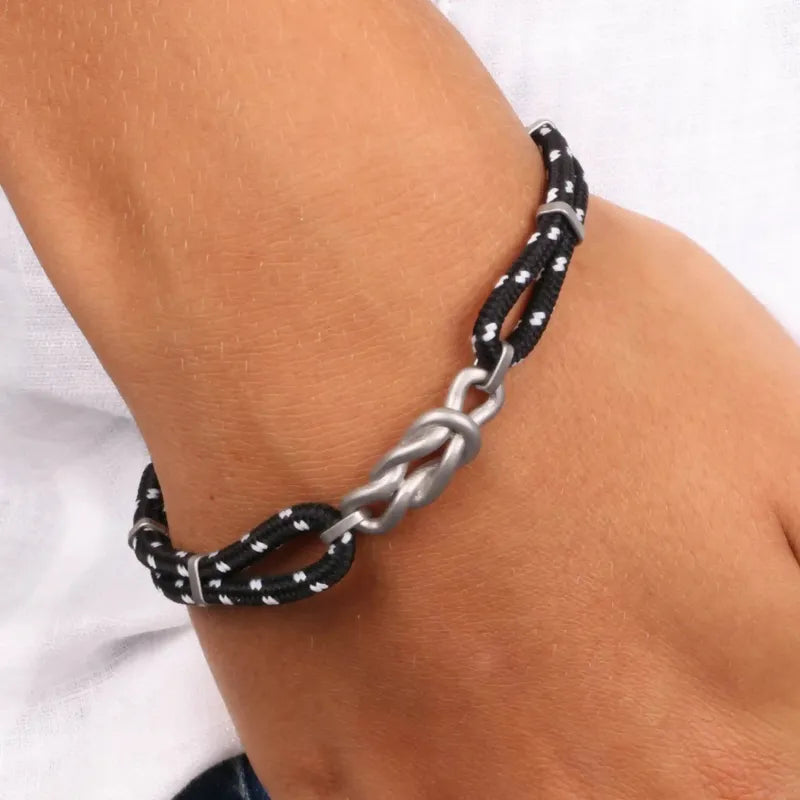 Brazalete de Acero con nudo náutico central de tela negra y blanca
