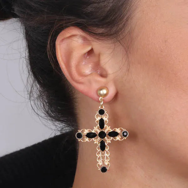 Orecchini in Metallo  pendenti con simbolo croce impreziositi da smalto nero
