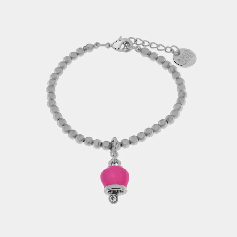 Bracciale in Metallo maglia a sfere con campanella portafortuna pendente impreziosita da cristalli