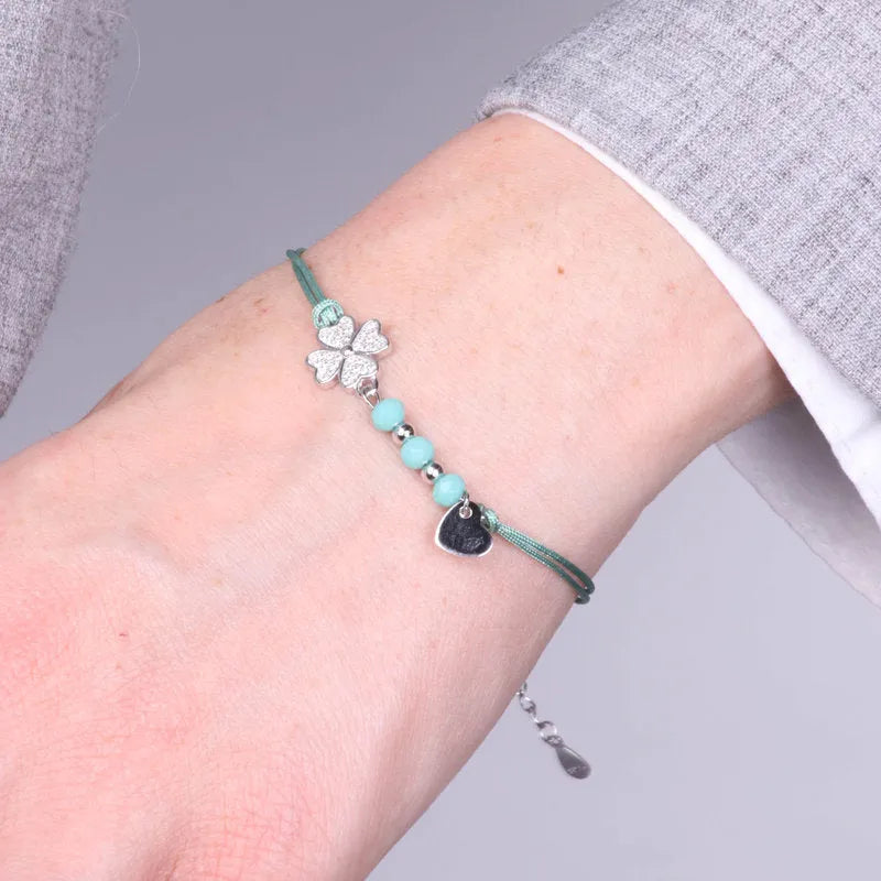Bracciale in Argento 925 cordino verde e quadrifoglio