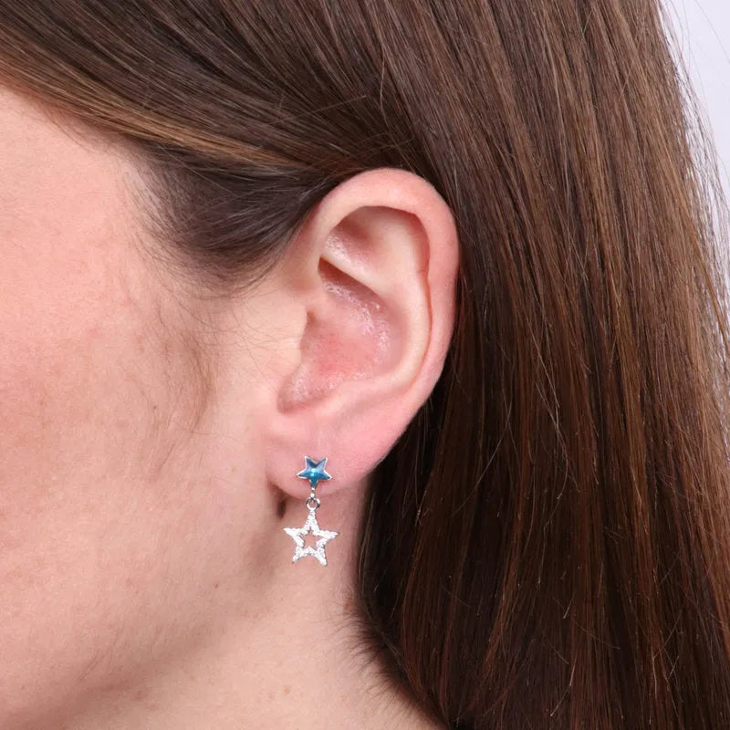 Orecchini in Argento 925 stella zirconata pendente e stella blu a lobo