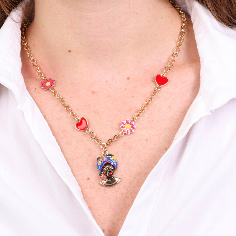Collana in Metallo con Testa di Moro blu cuori e fiori