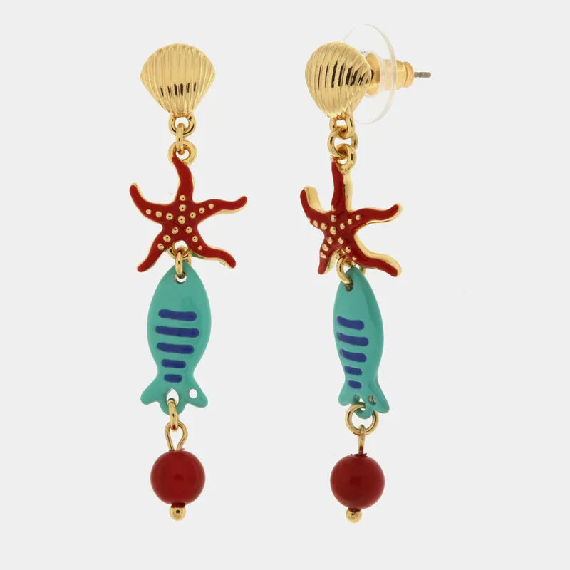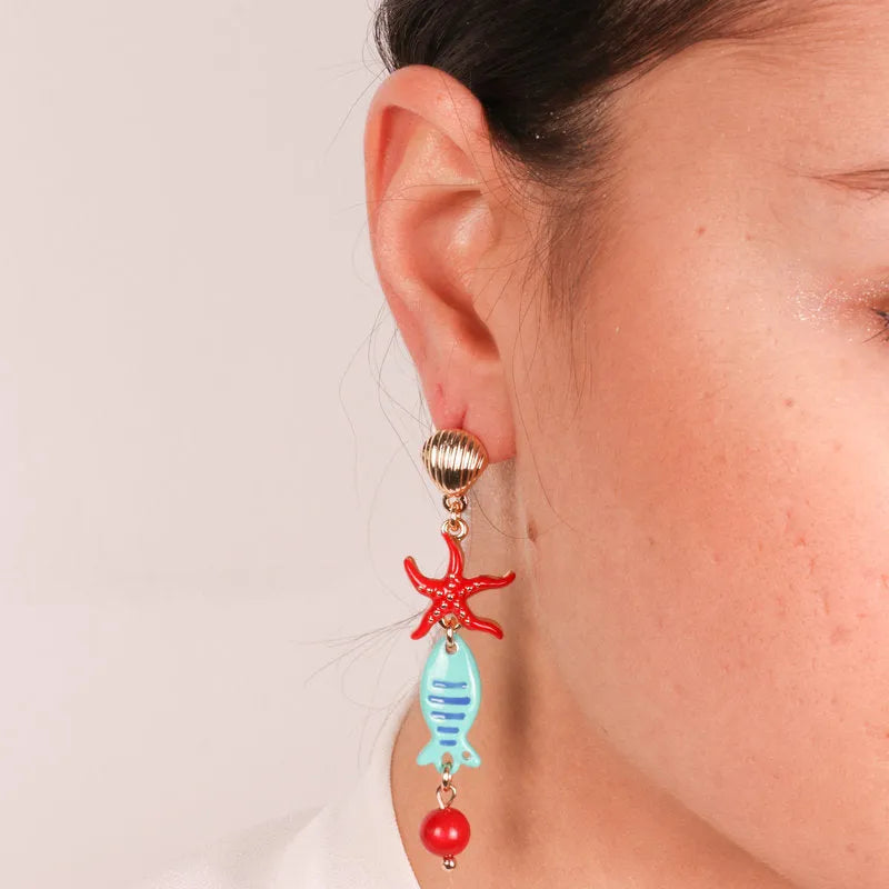Orecchini in Metallo con conchiglia al lobo e stella marina e pesciolino pendenti