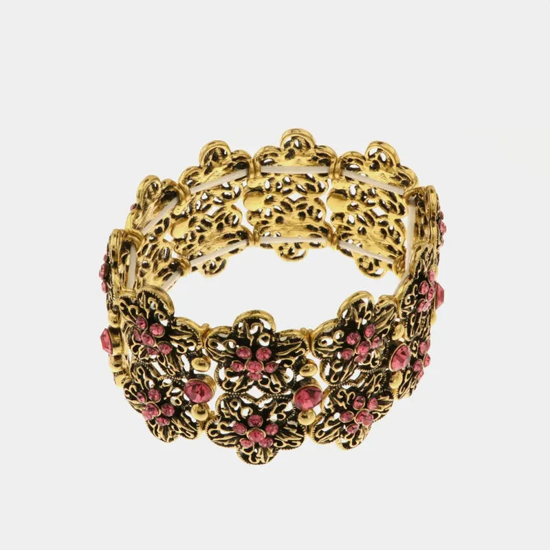 Bracciale in Metallo elastico, con fiori e cristalli rosa