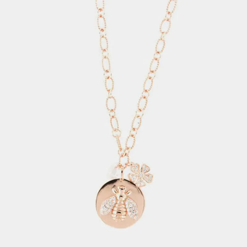 Collier en Argent 925 avec abeille sur plaque, rehaussé d'une fleur de zirconiums blancs et de points de lumière sur les ailes.