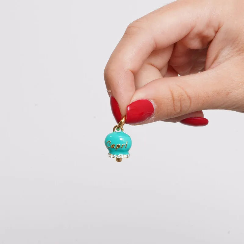 Ciondolo in Acciaio campanella verde acqua e oro scritta Capri  e zirconi