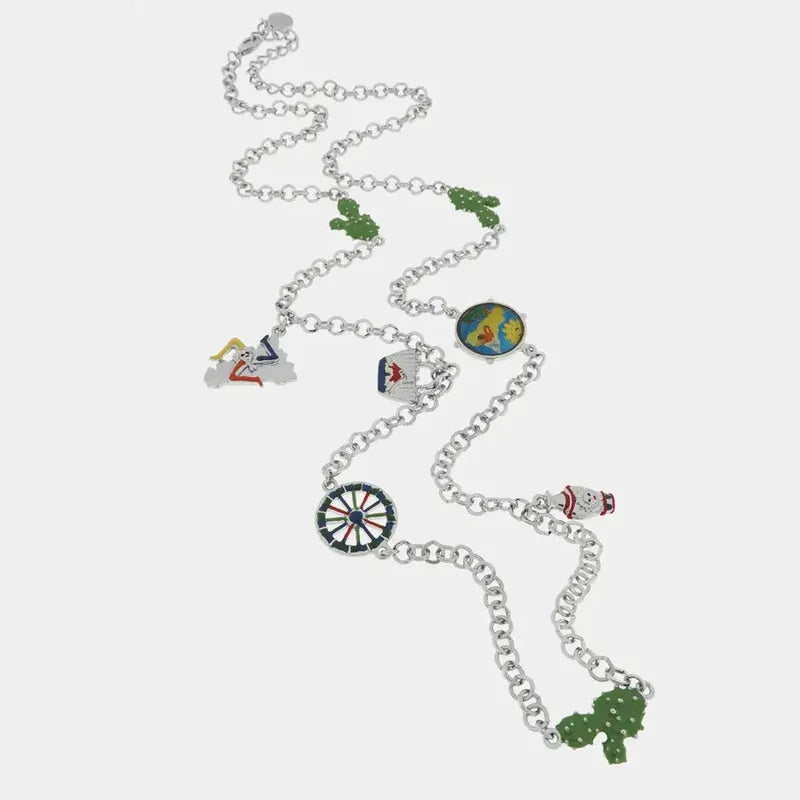 Collana in Metallo catena rolò con charm colorati siciliani, tamburelli, coffa, trinacria e fichi d'india