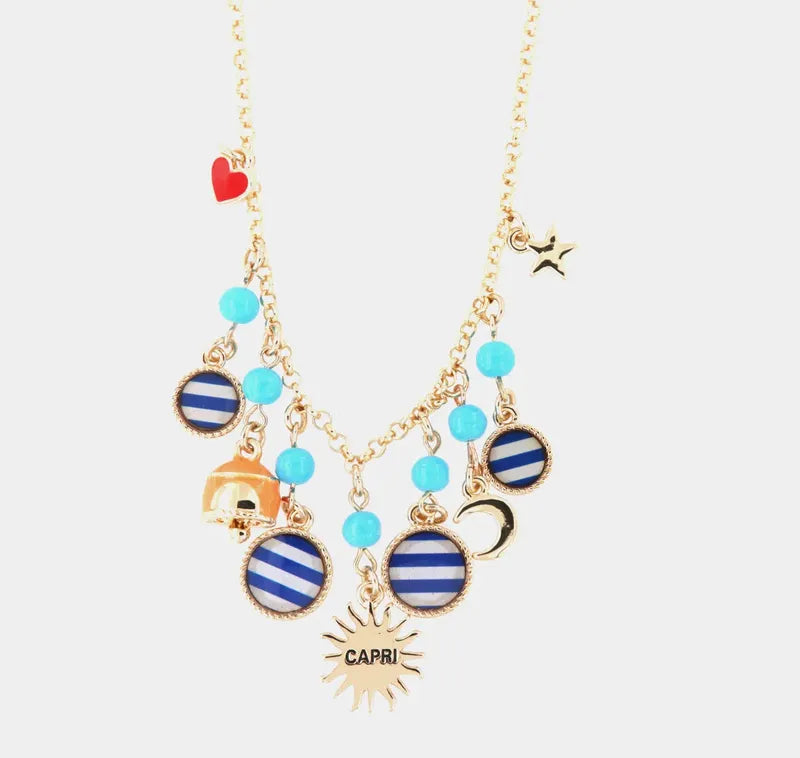 Collana in Metallo in stile marino, con sole scritta Capri, campanella e luna