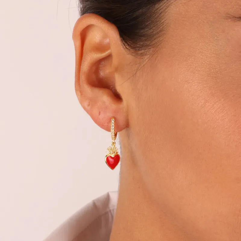 Orecchini in Argento 925 con chiusura a scatto tempestata da zirconi bianchi e ex voto smaltato rosso