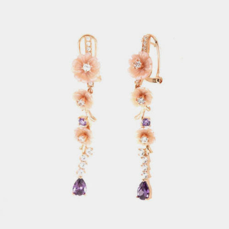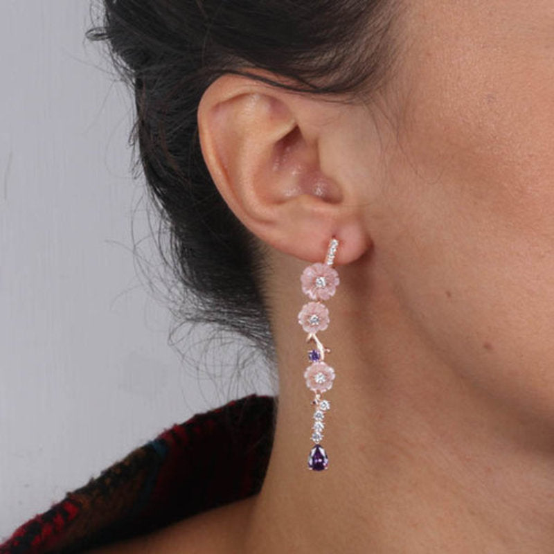 Orecchini in Argento 925 pendenti con fiori in madreperla, zirconi bianchi e punti luce viola