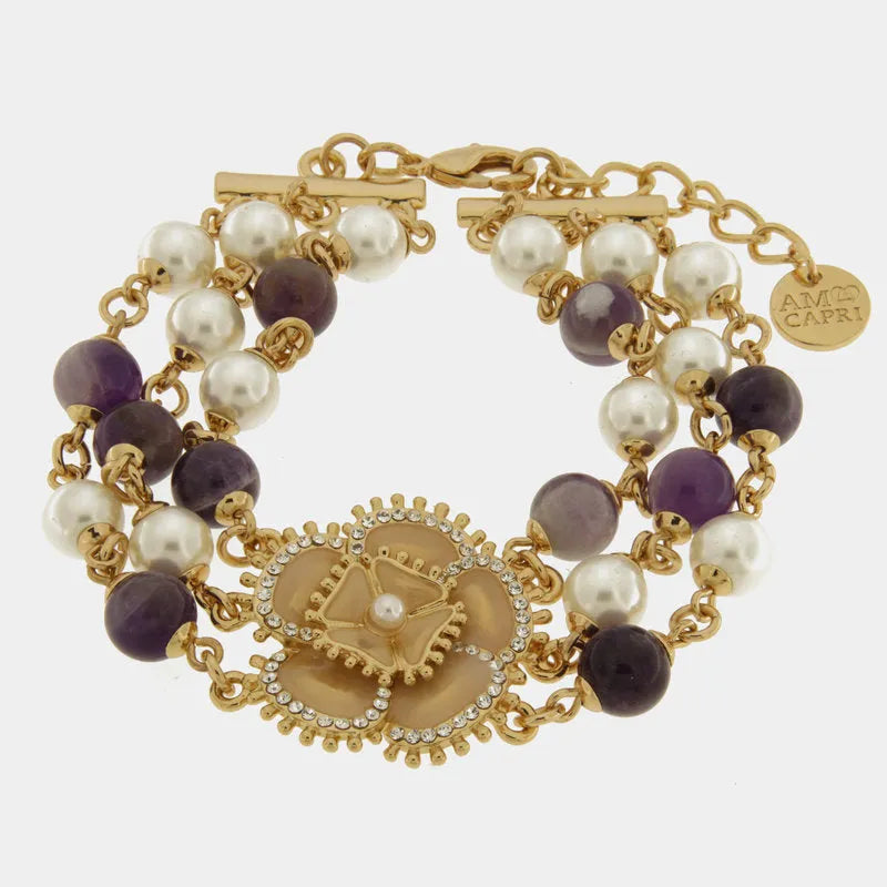 Bracciale in Metallo multifilo con fiore e perle placcato oro