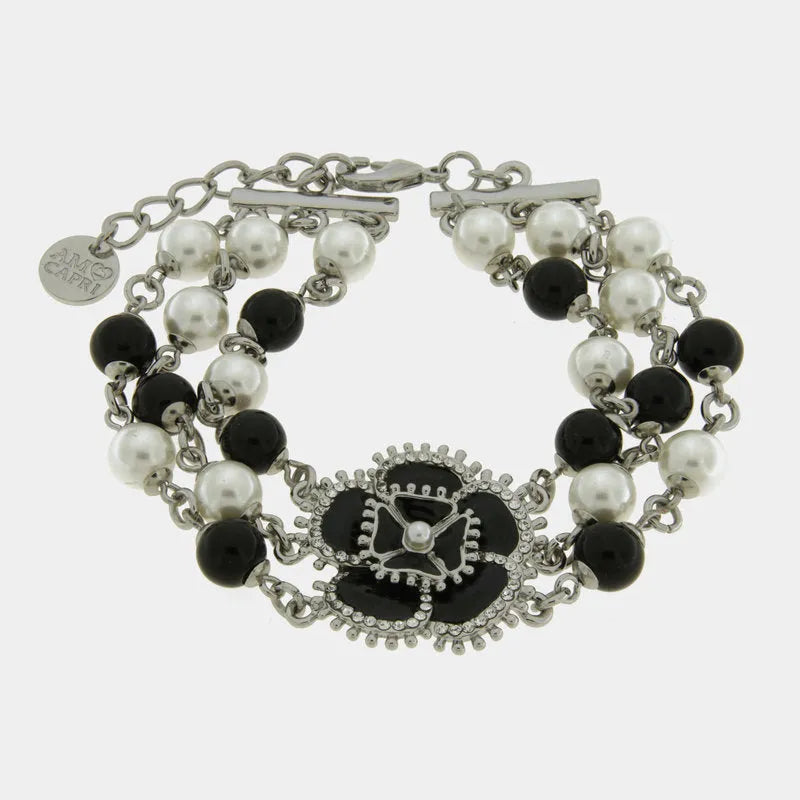 Bracciale in Metallo multifilo con fiore nero e perle bianche