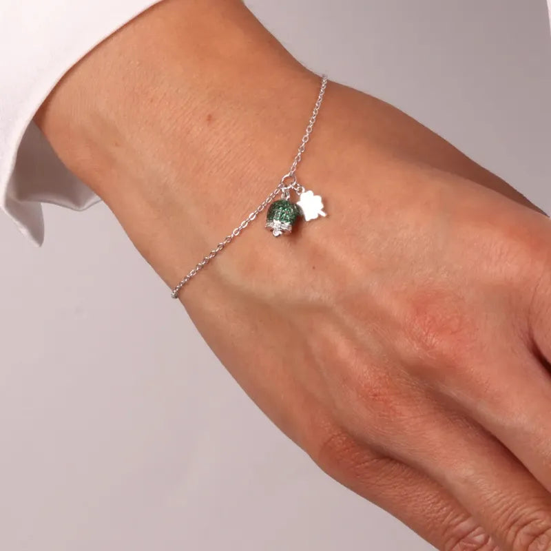 Bracciale in Argento 925 campanella portafortuna impreziosito da zirconi rossi e quadrifoglio