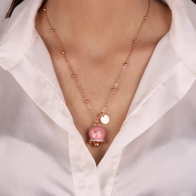 Collana in Metallo con campanella grande rosa e scritta Capri impreziosito da cristalli bianchi