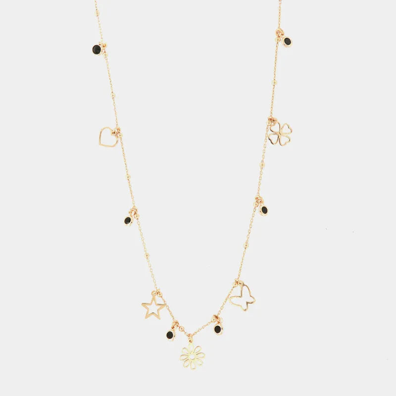 Collana in Argento 925 con ciondoli pendenti: cuori, stelle e fiori impreziositi da cristalli neri
