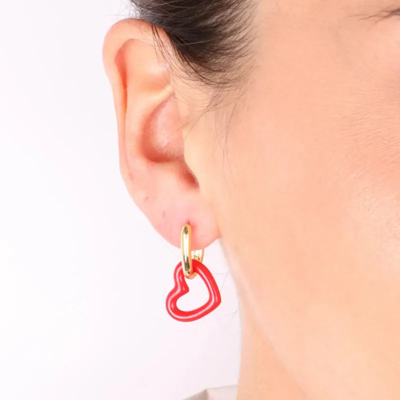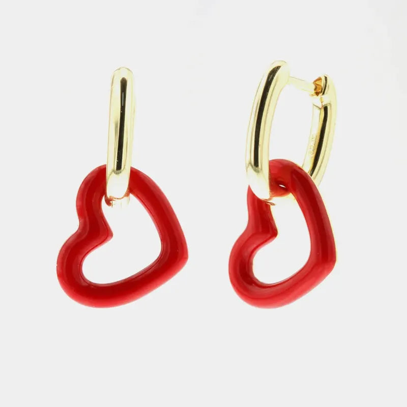 Orecchini in Argento 925 ovali placcati oro giallo con pendenti a forma di cuore smaltati rossi