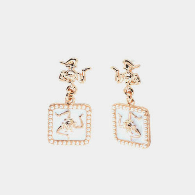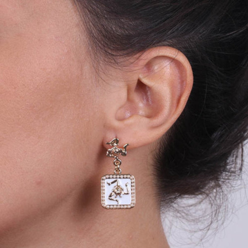Orecchini in Metallo con mattonella pendente impreziosita da simolo trinacria siciliana e smalto bianco