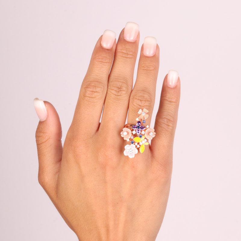 Anello in Argento 925 con fiori in madreperla impreziosito da zirconi colorati