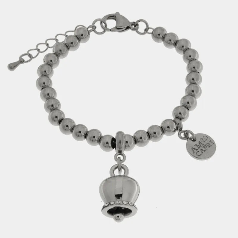 Bracciale in Acciaio maglia a sfere, con campanella portafortuna impreziosita da cristalli