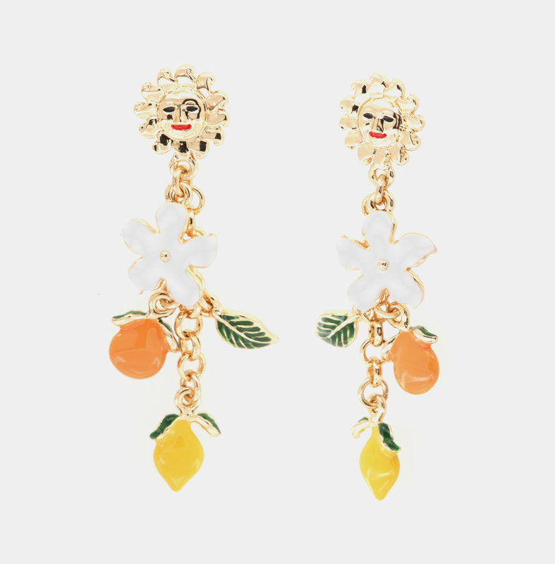 Orecchini in Metallo pendenti, con fiori ed agrumi di Sicilia impreziositi da smalti colorati