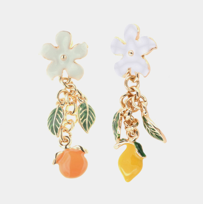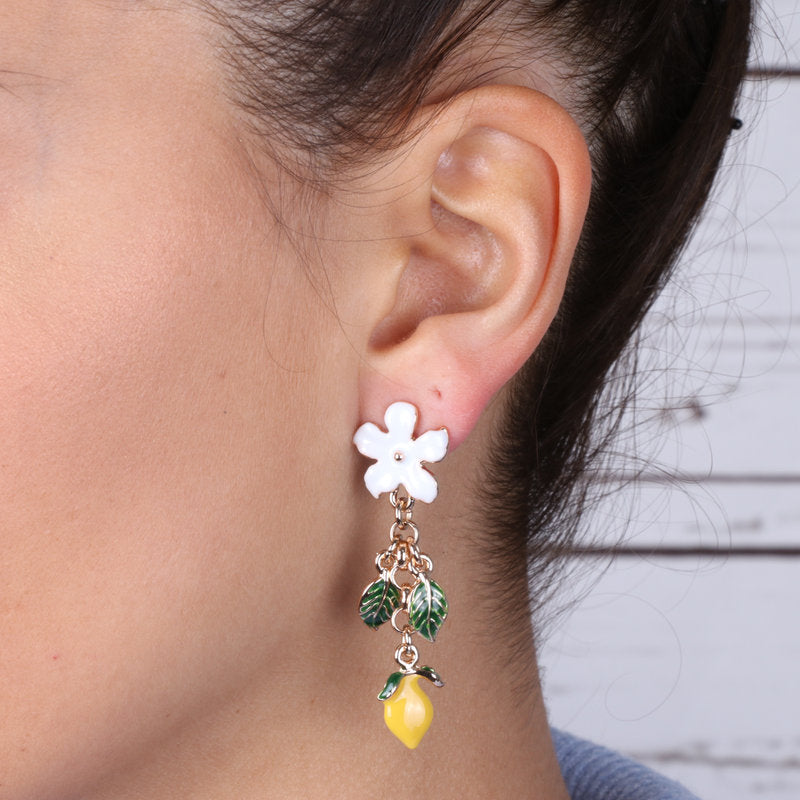 Orecchini in Metallo pendenti, con fiori ed agrumi di Sicilia impreziositi da smalti colorati