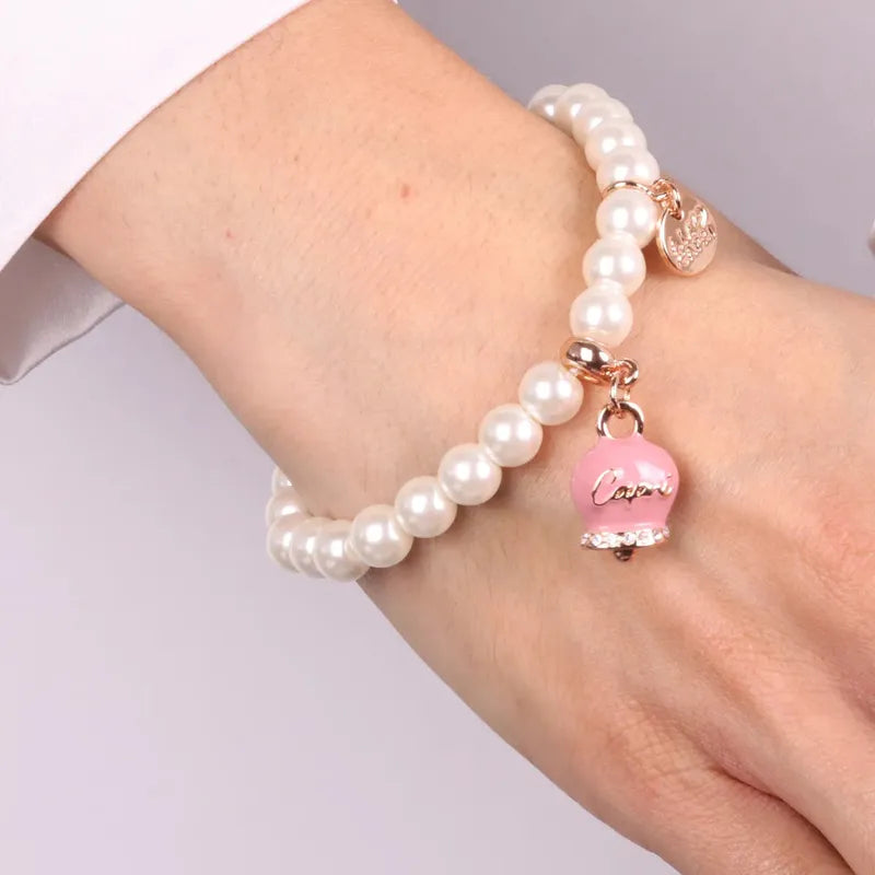 Bracciale in Metallo Bracciale in Metallo con perle e campanella portafortuna in smalto rosa con scritta Capri