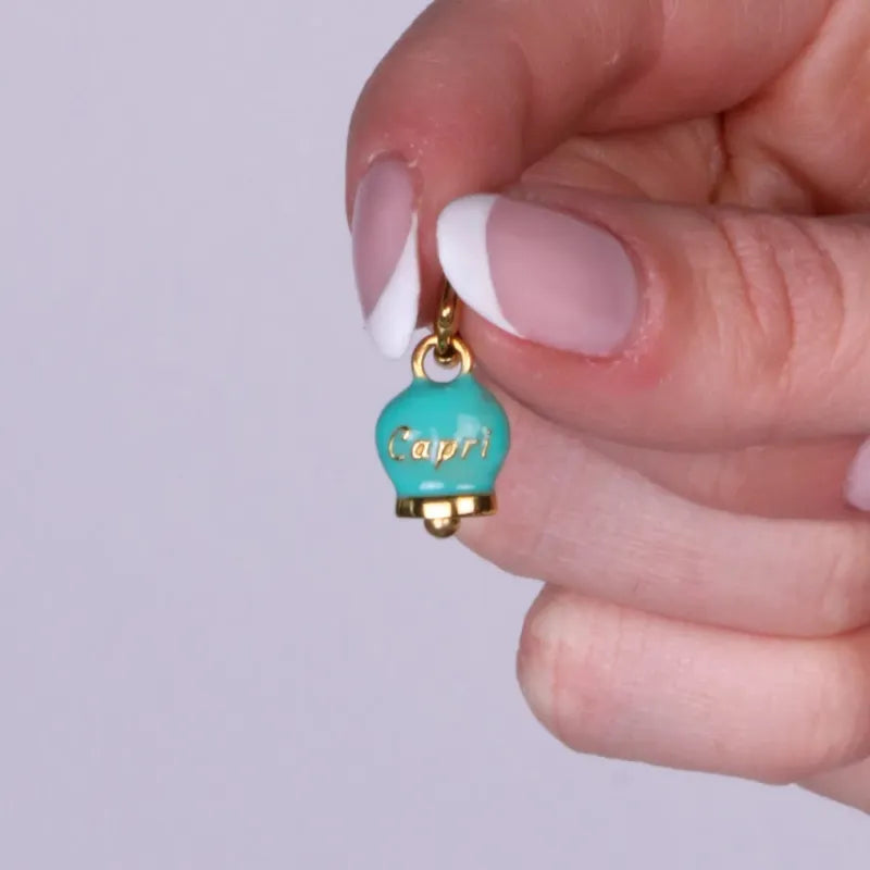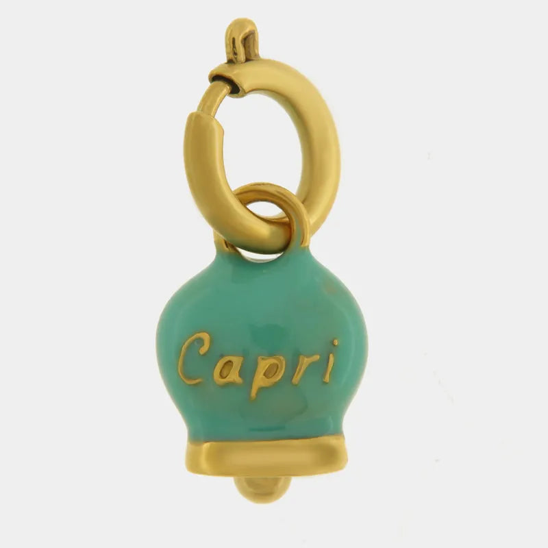 Ciondolo in Acciaio campanella verde acqua placcata oro con scritta Capri