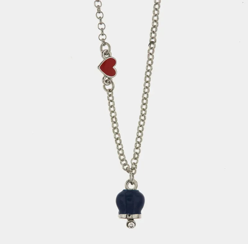 Collana in Metallo con cuore rosso e campanella portafortuna pendente blu, impreziosita da punto luce