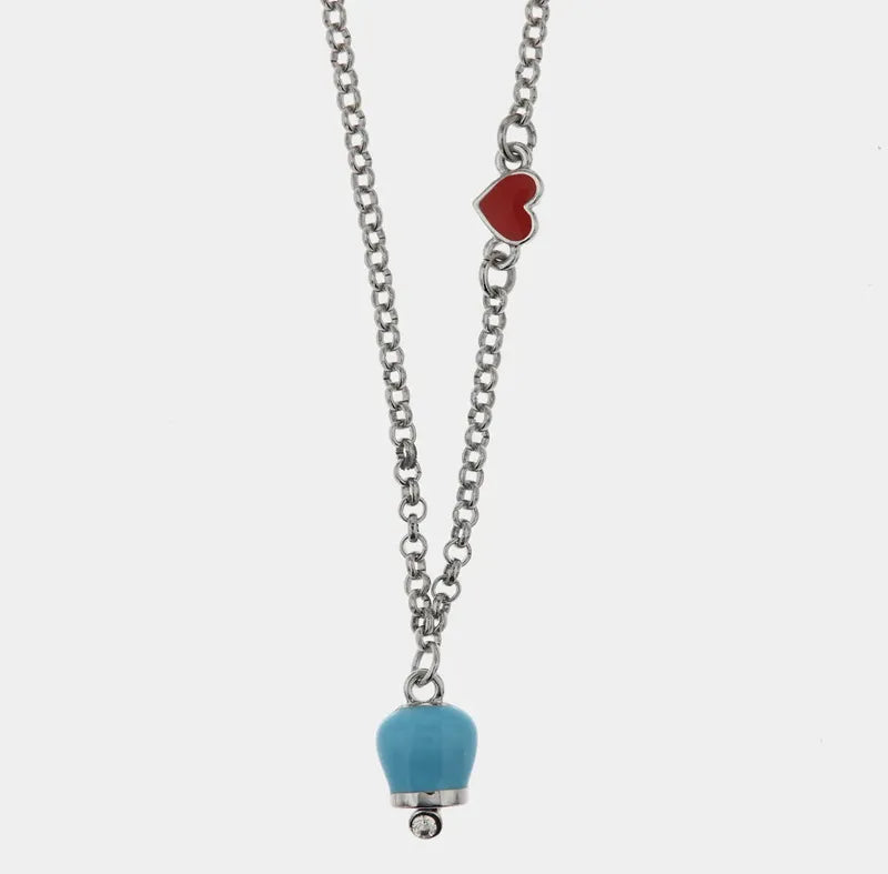 Collana in Metallo con cuore rosso e campanella portafortuna pendente con smalto azzurro, impreziosita da punto luce